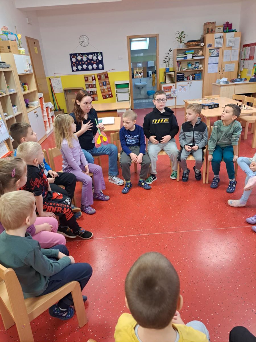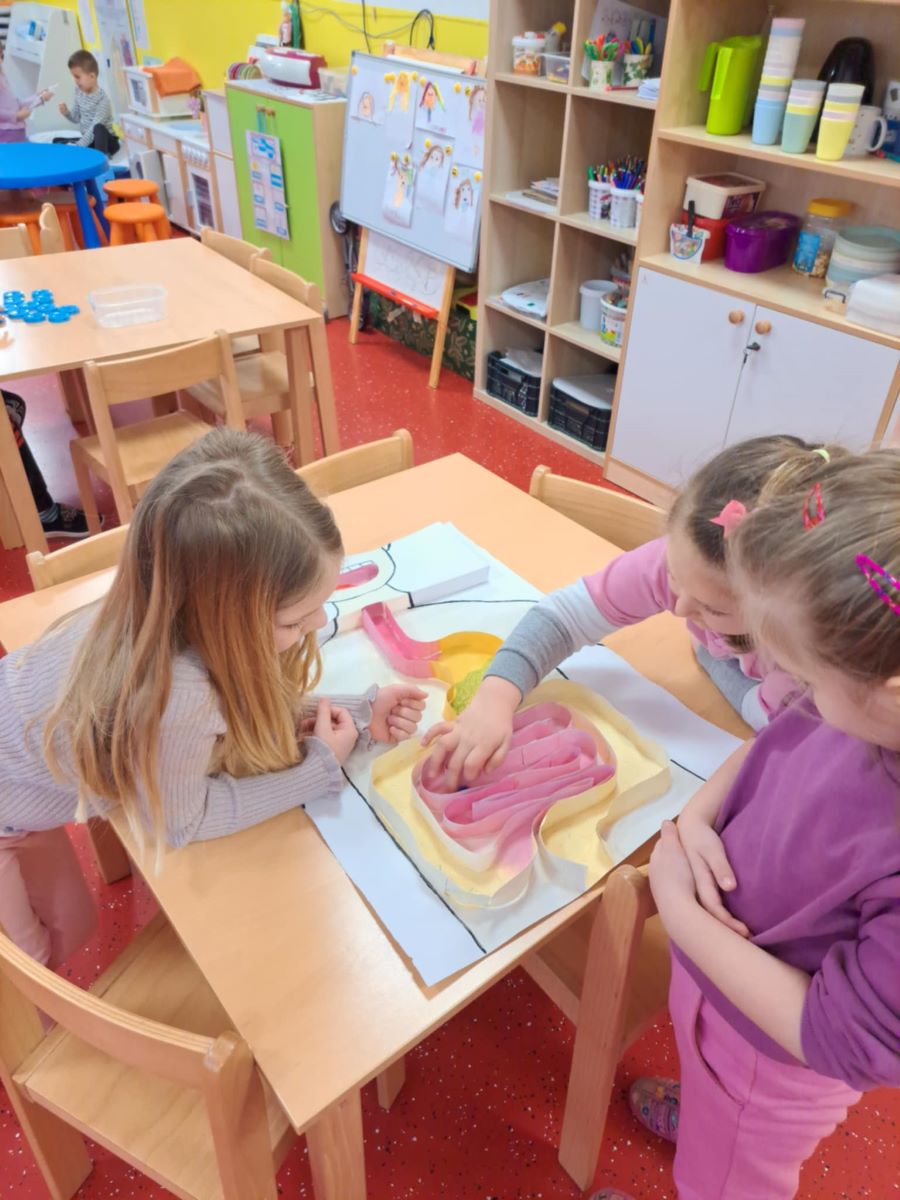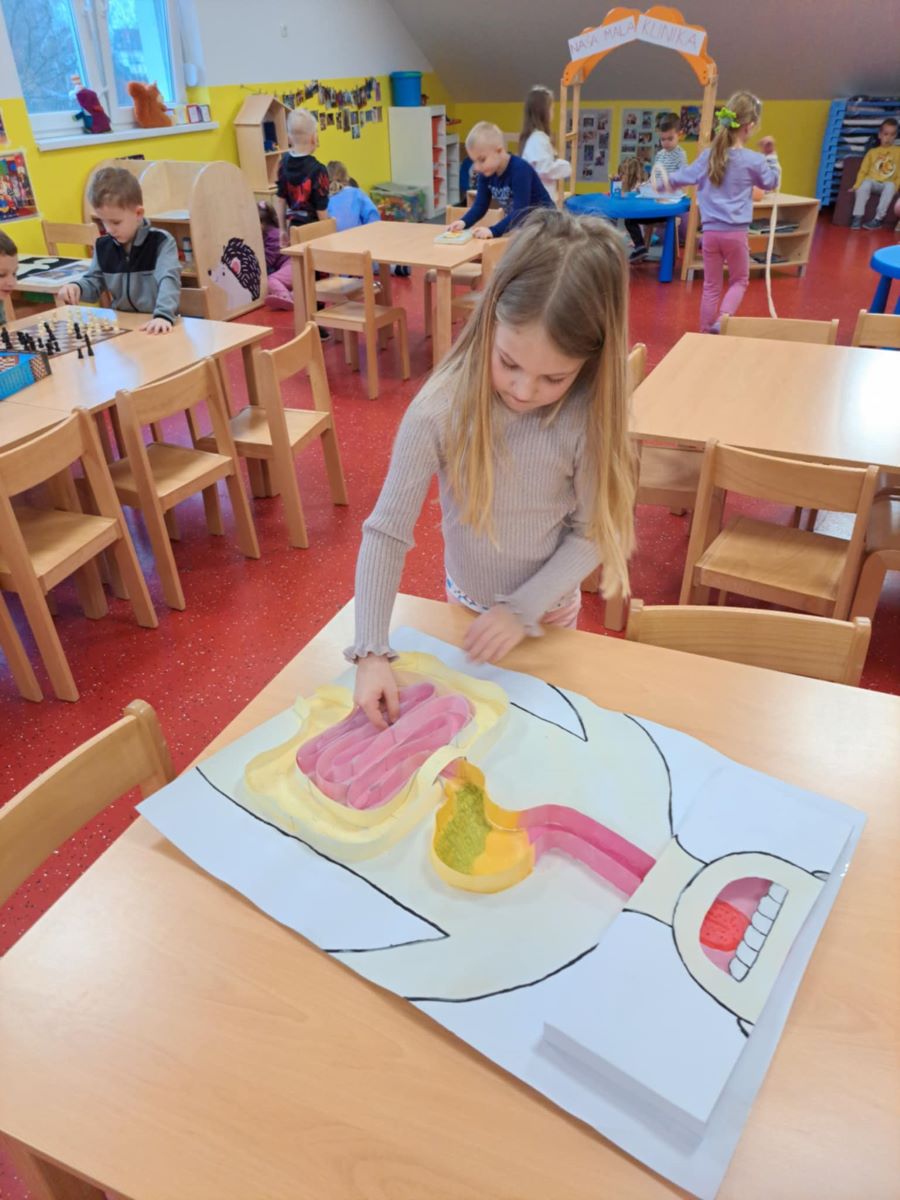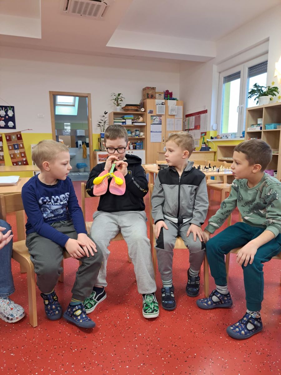 Zdravstvena voditeljica je s nama razgovarala o dišnom i probavnom sustavu čovjeka, a mi smo sa zanimanjem odgovarali na njezina pitanja.O tome kako dišemo saznali smo i isprobali kroz aktivnost puhanja u balone koji su predstavljali naša pluća. Kroz 3D prikaz probavnog sustava saznali smo nešto više o organima koji tvore naš probavni sustav te smo uz pomoć zdravstvene voditeljice izvodili pokus o tome kako se hrana razgrađuje u našem tijelu.