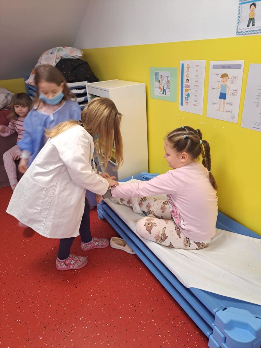 Budući da smo u zimsko doba svi podložniji prehladama i raznim drugim virozama, bilo je pravo vrijeme da otvorimo našu malu kliniku u Zvjezdicama. Pripremili smo prostor i pult za prijem pacijenata,čekaonicu,ordinaciju, nabavili smo potreban pribor i igra je mogla početi. Iako je red čekanja bio duži, pacijenti su strpljivo čekali da dođu na pregled. U ulogama liječnika i medicinske sestre izmjenjivali smo se svi zainteresirani za ovakvu igru.Osim igre uloga-liječnika igrali smo memory od čepova ispod kojih su se nalazile razne bakterije i virusi,slagali smo razne slagalice o ljudskom tijelu a u posjeti nam je bila i naša zdravstvena voditeljica Petra.